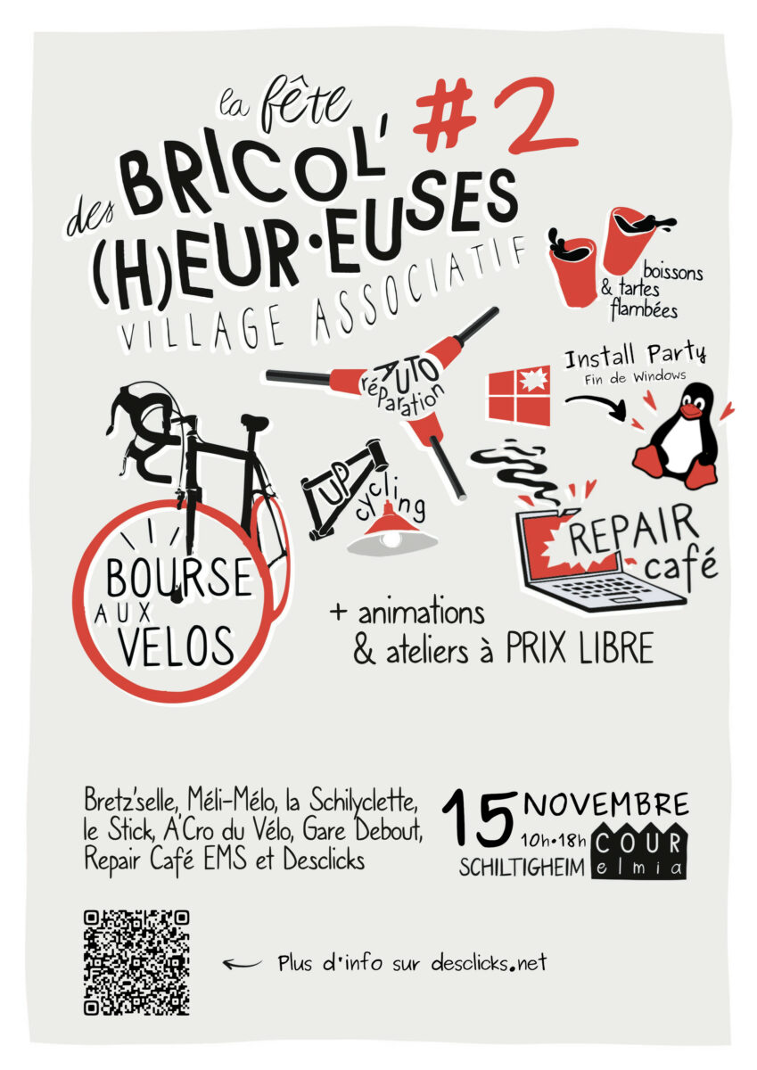 Après le succès de la première édition à Schiltigheim en octobre 2024, on revient le 15 novembre 2025 ! Les associations Bretz’selle, Emmaüs Mundo boutique Meli Melo, Desclicks , La Schilyclette, Gare Debout, le Stick et Repair Café EMS s’associent pour vous offrir une journée riche en activités et en découvertes !