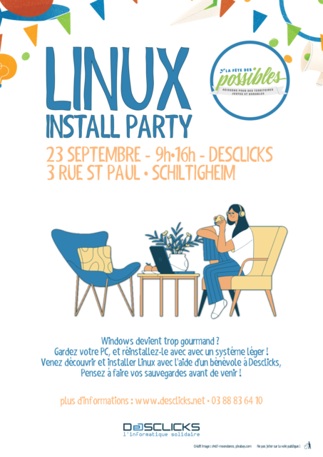 Install Party Linux – Prolongez la vie de votre PC 23 septembre 2023Install Party Linux - Prolongez la vie de votre PC9:30 - 16:00Desclicks Plus de détails »Atelier