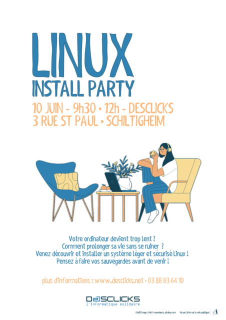 Install Party Linux – Prolongez la vie de votre PC 10 juin 2023Install Party Linux - Prolongez la vie de votre PC9:30 - 12:00Desclicks Plus de détails »Atelier